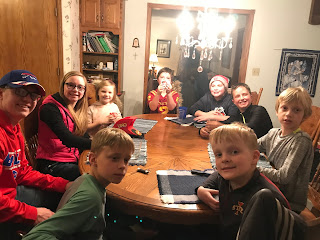 We played a lot of games at the kitchen table this trip. It was pretty fun. Here we are playing Uno Attack, which spits cards at you if you have to draw. Sometimes nothing comes out and sometimes a pile spits out. It was pretty fun. Counter Clockwise starting with me (Caden), Zeek, Alishea, Marley, Isaak, Clara, Wyatt, Pearson and Hendrix.