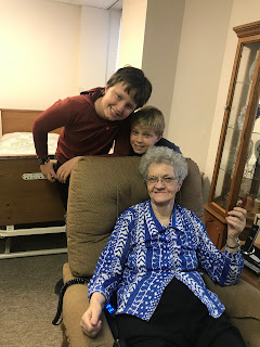 We went to visit Great Grandma Mary at the nursing home. She was very excited to see us and it was fun chatting with her. She had to move rooms while they do construction in her wing. We brought her some pastries from the bakery which made her very happy.