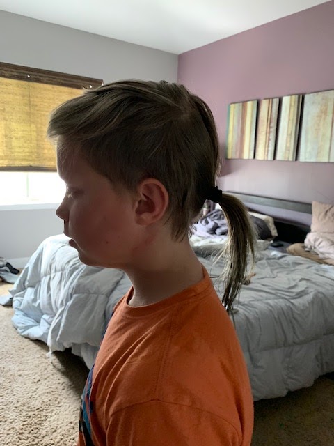 Papa NJ, this one’s for you! As you all know, I’ve been growing out my rat tail for quite some time now. I’m planning to cut it off at 5th grade graduation, but we’ll see. I was curious to see how long it had gotten and to see if we could clean it up a bit. Mom took this picture so I could see what it looked like in a ponytail.