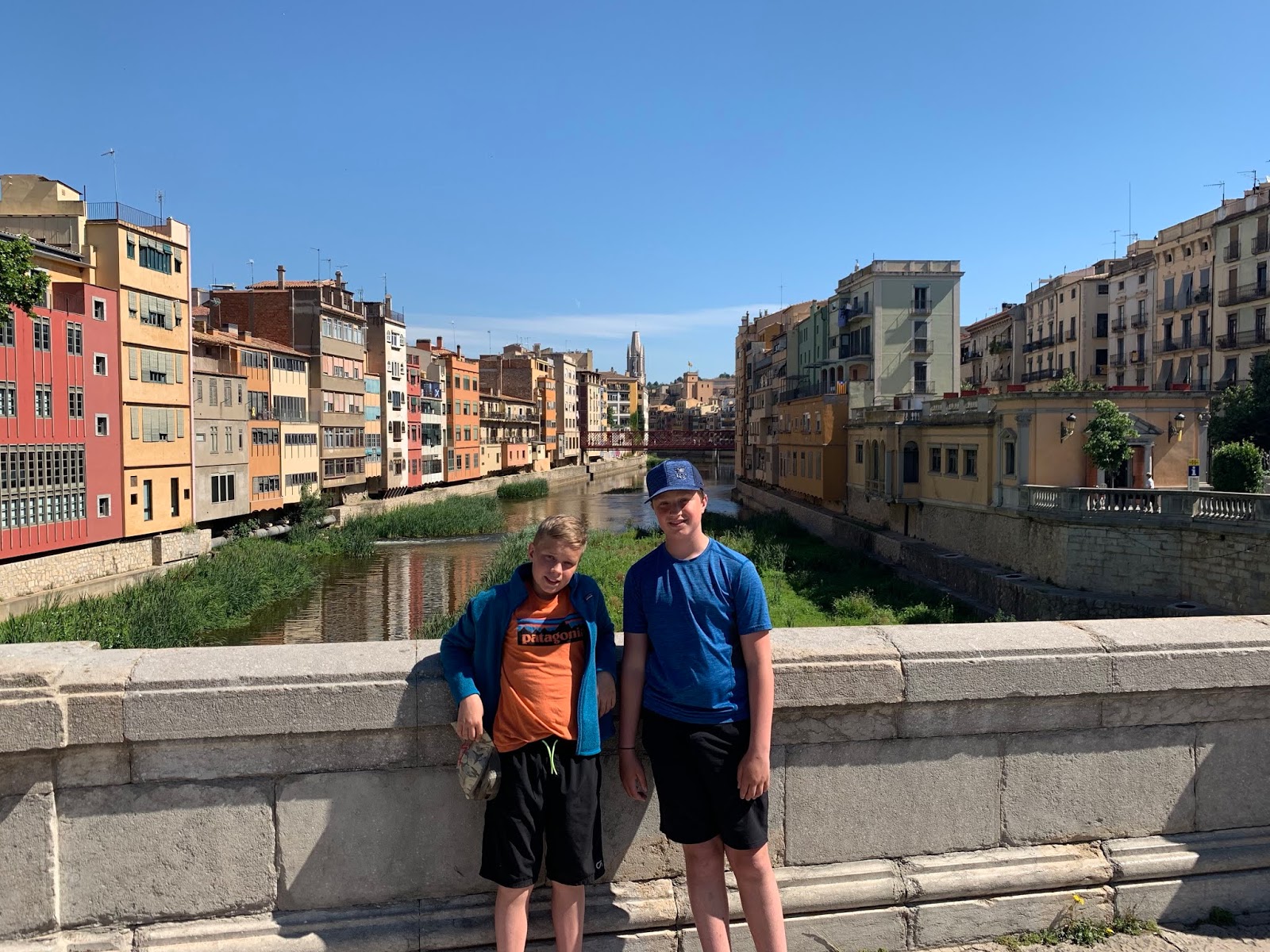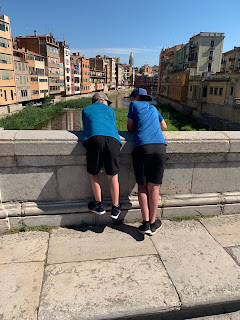 We took a high speed train to Girona for a day trip. We loved this little town. It was one of our favorite places we visited. We stopped for a picture on the bridge before venturing in to town. There were huge fish in the river.