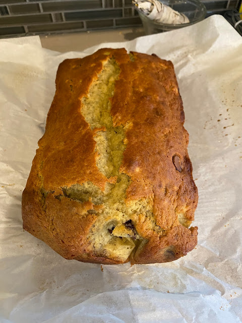 We have been doing a LOT of baking. We are trying to cut back. We made a loaf of banana bread with chocolate chips. It is delicious!