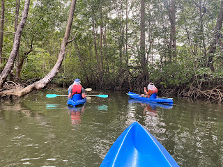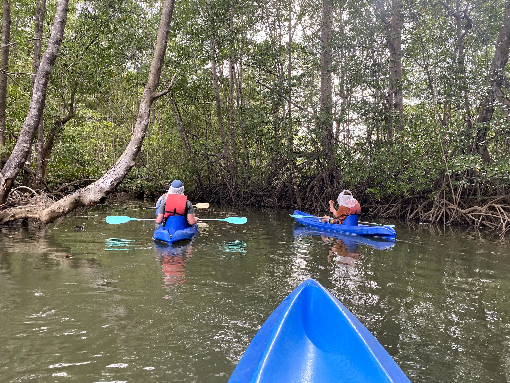 We went kayaking in the mangroves at Isla Damas. It was very hot and there were little black bugs that fly around, sometimes in to the nose and ears, which is why we wore the net, which made it hotter. It was still pretty neat to see.